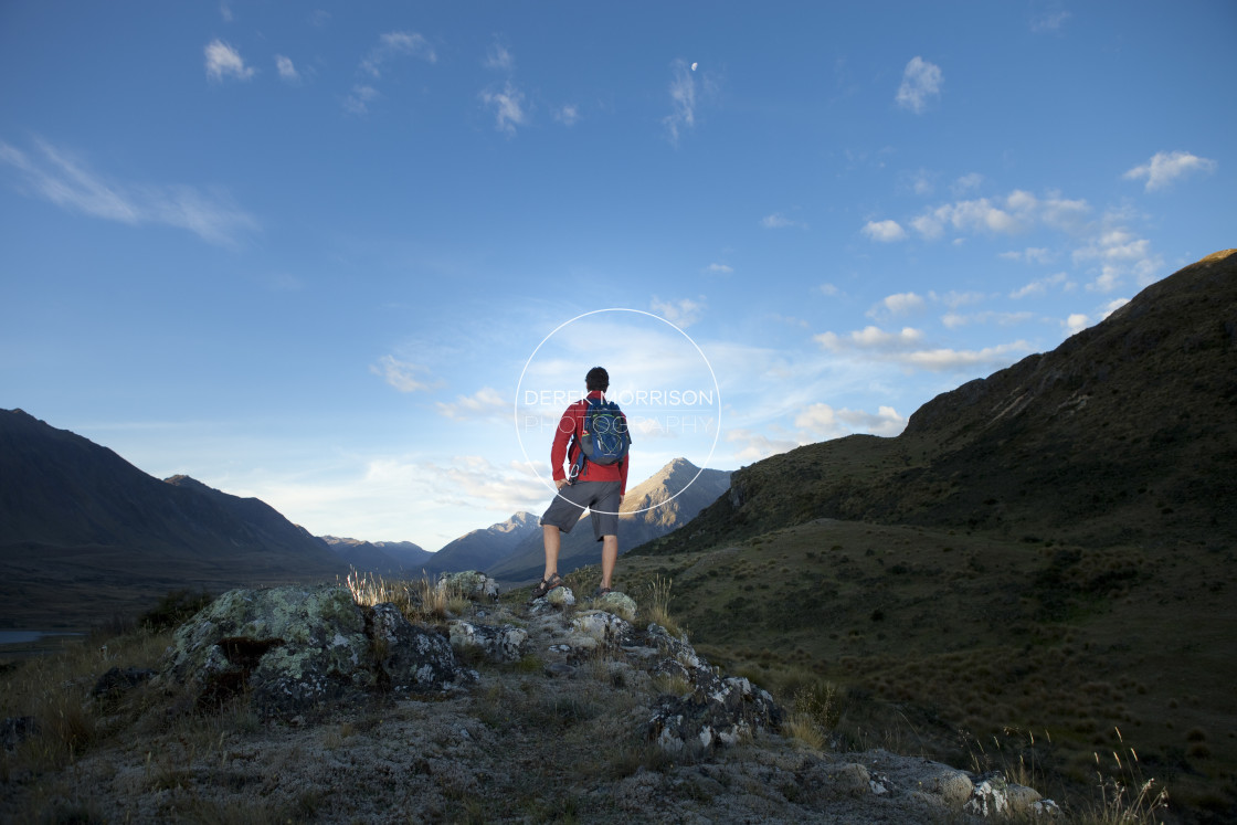 Dallas Hewett hiking with Mount Mavora in the background, Southland, New Zealand.