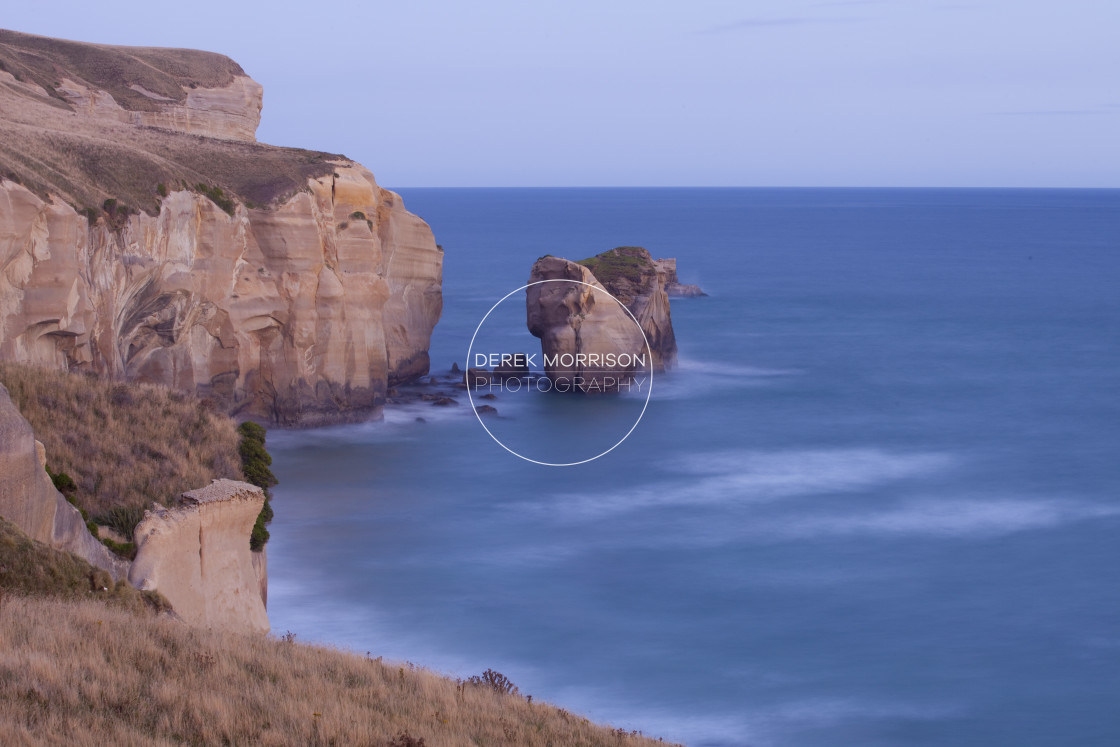 The South Pacific Ocean meets the cliffs at Tunnel Beach on dusk, Dunedin, New Zealand.