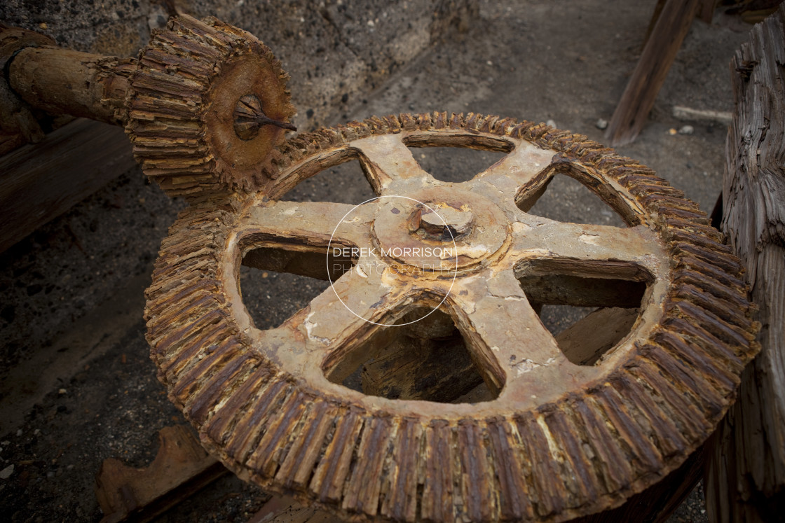 Gears from an old sulphur mine rust away on White Island – an active volcano located 48km (30 miles) off the east coast of the North Island from Whakatane, Bay of Plenty, New Zealand.