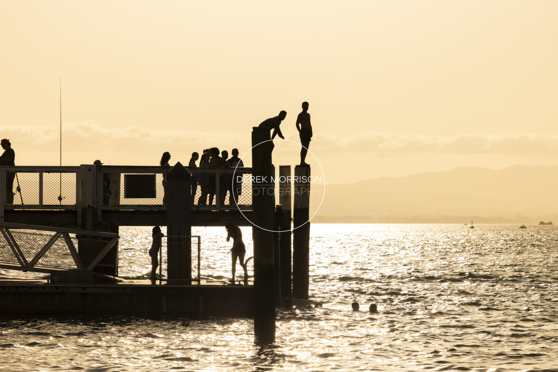 Walter Rudolph, 24, and Xzavier Coventry, 27, enjoy cooling off with a late afternoon session of manus and dives off Salisbury Wharf, Mount Maungan...