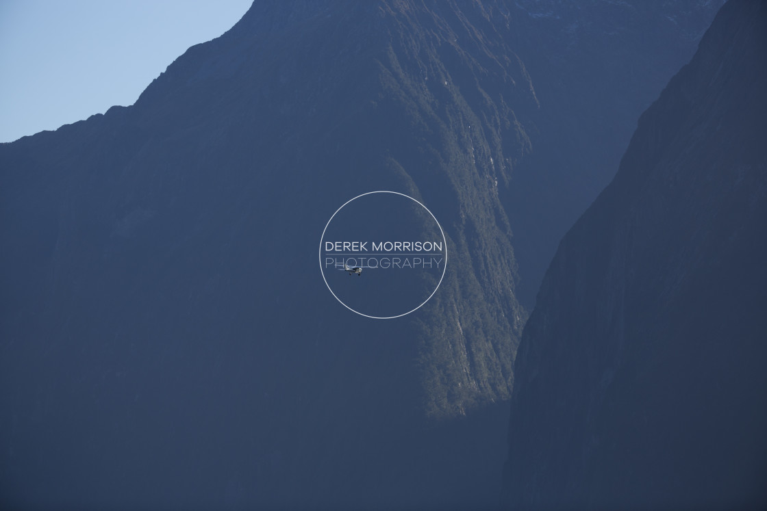 An airplane gives tourists a scenic flight in Milford Sound, Fiordland, New Zealand.