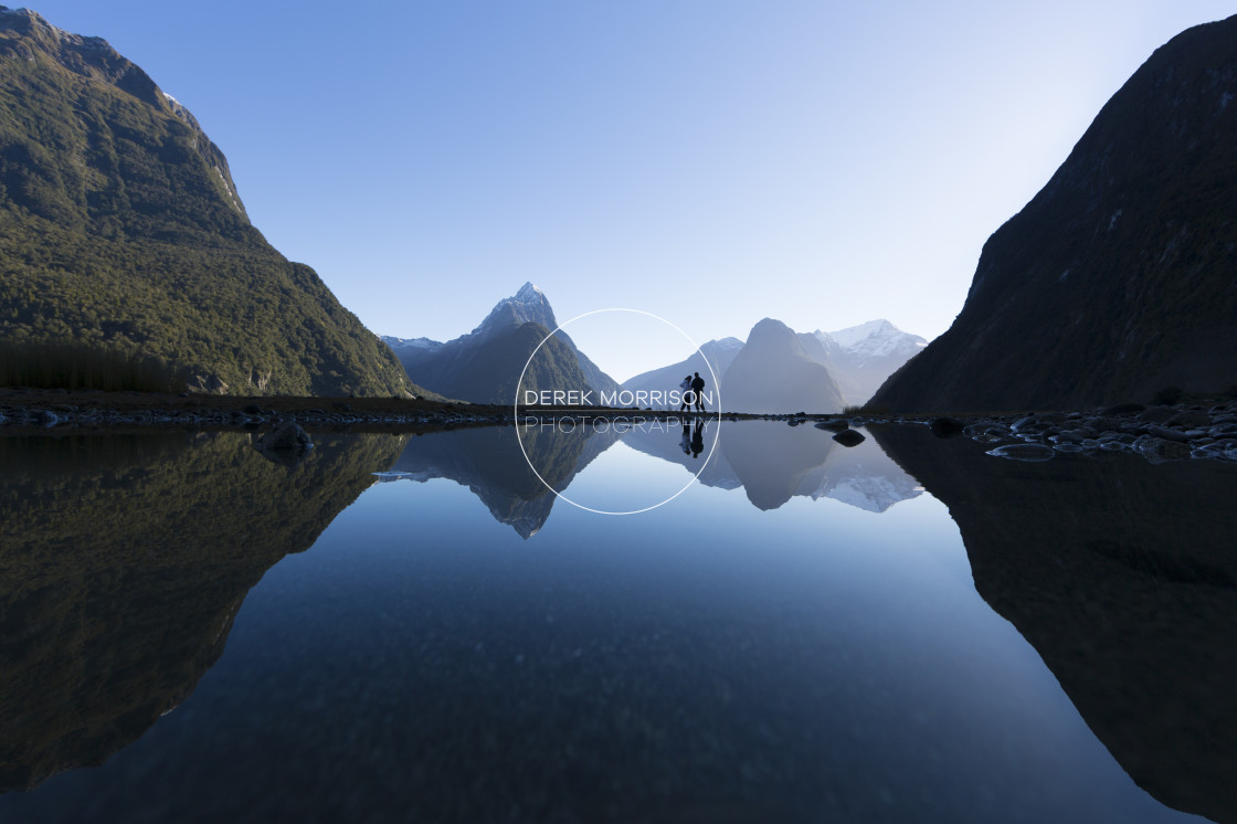 Travellers Ollie Shand and Coline Serra take in the views to Mitre Peak, Milford Sound, New Zealand.