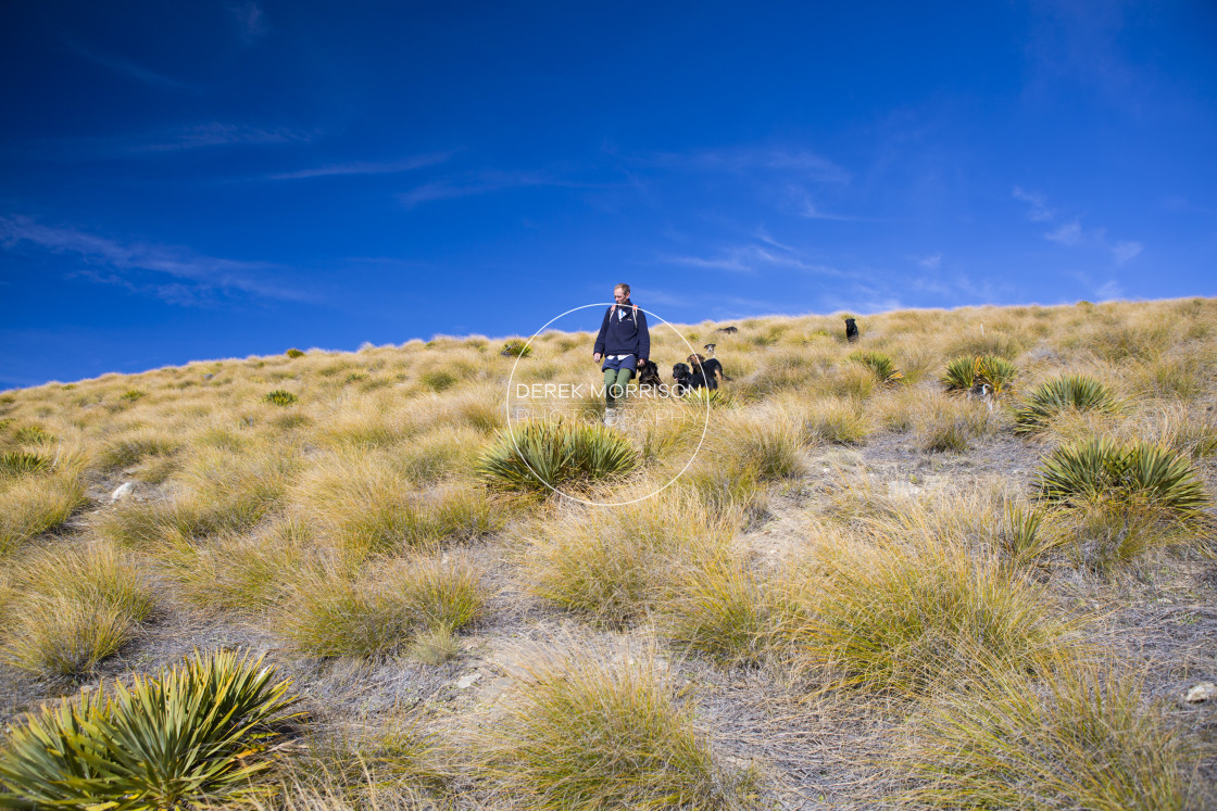 Philip Rive and his dogs during the Autumn muster of the lake face at Cecil Peak Station, Lake Wakatipu, Central Otago, New Zealand.